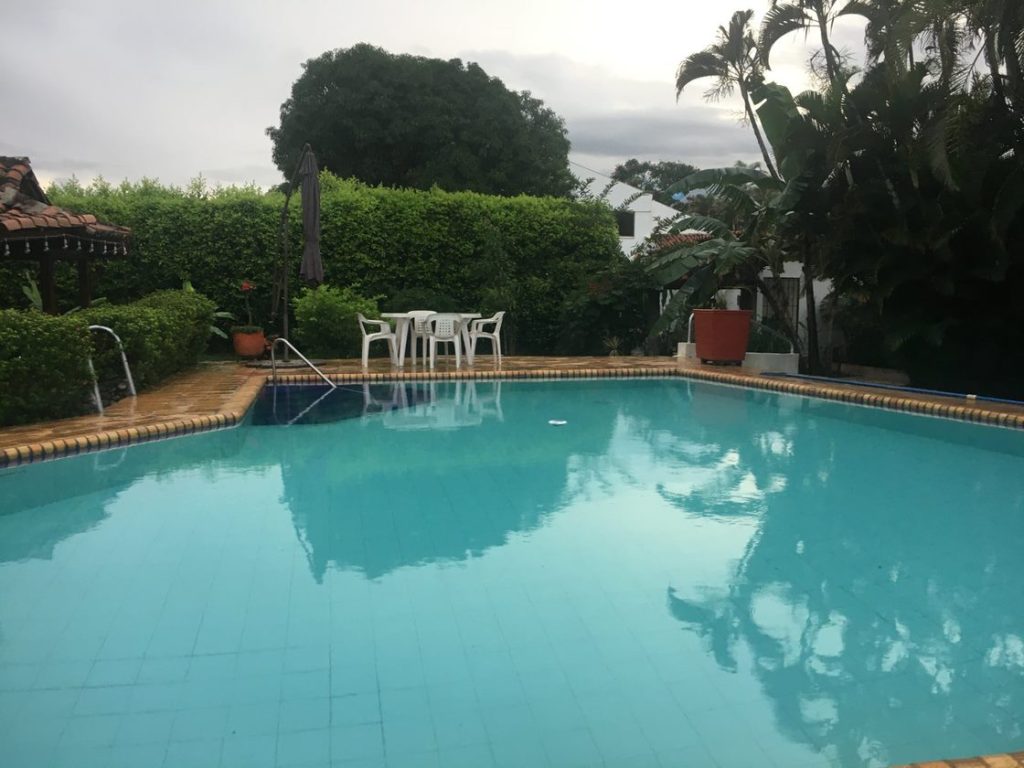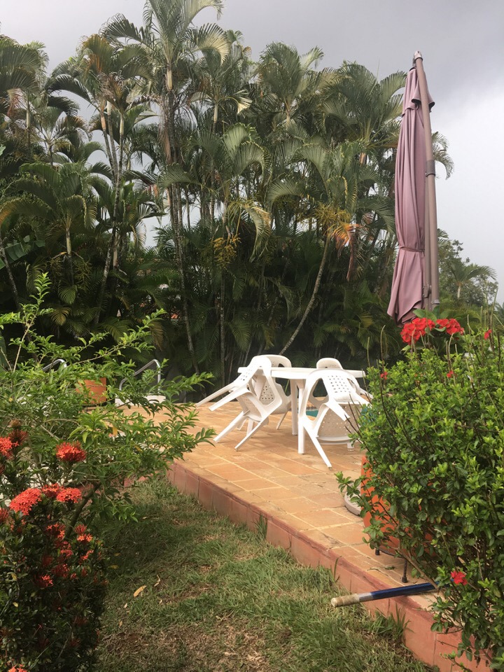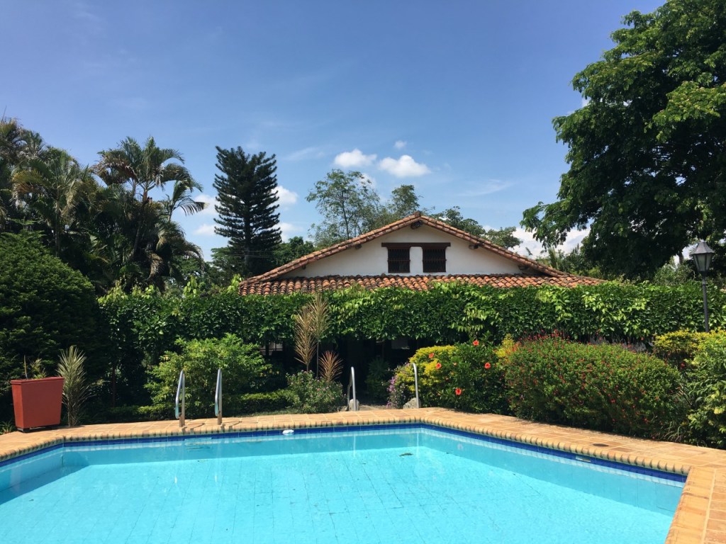 Esta hermosa casa campestre de seis cuartos y ocho baños está construida en tres mil metros cuadrados los cuales tienen hermosos jardines, 8 arboles frutales para su disfrute; un kiosco grande para reuniones y uno pequeño para asados. Tiene también una amplia piscina que incluye un parasol o sombrilla para dar sombra, ducha grande y espaciosa; separadamente hay un vestier, o cuarto para cambiarse, un baño pequeño, un cuarto para guardar cosas; un cuarto grande estilo patio con techo y piso empedrado donde está la lavadora, el lavadero, cuerdas para colgar la ropa y espacio para mesa y asiento para doblar la ropa; enseguida, hay dos perreras para encerrar los perros o para guardar cosas si se quiere; dos cuartos pequeños uno para la empleada o/y empleado, un cuarto con baño, dos cuarticos para herramientas y un baño completo. Garage cubierto para dos carros, y espacio dentro de la propiedad para diez carros más.